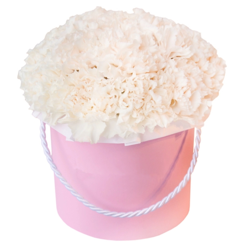 Букет состоит из 25 белых гвоздик, коробка, оазис.