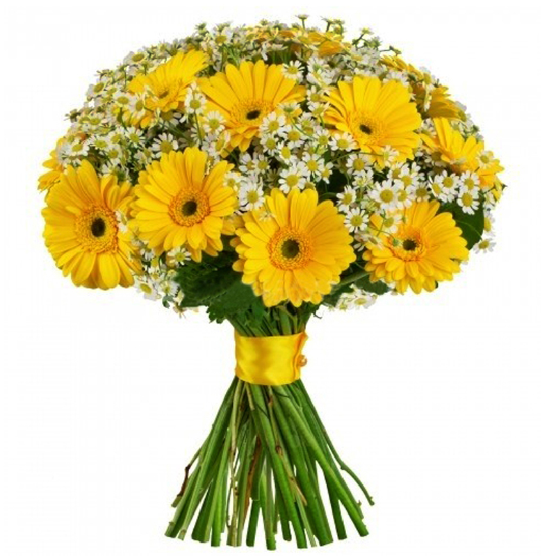 Букет состоит из 19 желтых гербер, 15 танацетум, салал, прозрачная упаковка, желтая лента.