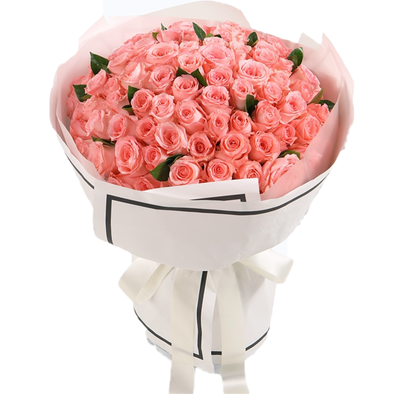 Букет состоит из 51 коралловая роза, прозрачная упаковка, атласная лента.